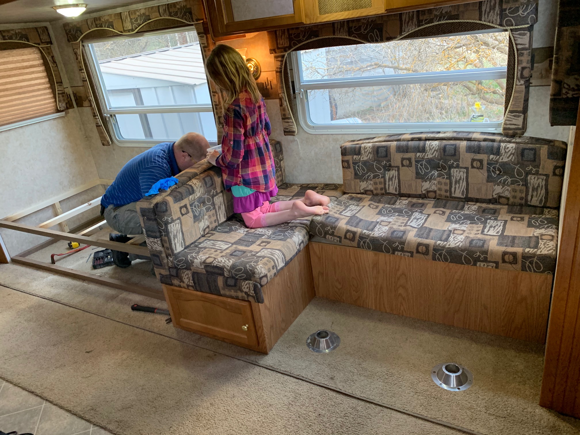 - Disassembled the dinette and used the pieces to create an L-shaped sitting area with the table turned the other way